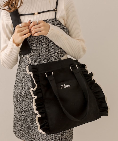 フリルとロゴ刺繍がポイントのトートバッグ■デザイン ・立体感のあるフリルとパイピングが可愛いデザイン。 ・丈夫でナチュラル感のあるキャンバスバッグは、季節を問わずお使いいただけます。・OLIVEのシンプルなロゴ入りで、コーディネートのポイントに。・ショルダーベルトを取り外せる便利な2way仕様。 ・しっかりとした大きさに広めのマチ幅で荷物を取り出しやすいです。・フロントには荷物をすぐに取り出せる大きめポケット付き。・裏地付きで、内側にも便利なポケットがついています。・A4サイズが収納可能。・新生活にもぴったりのガーリーアイテムです。■カラ―・アイボリー/ブラックの2色展開 お取り扱い上の注意※キャンペーンやフェアにより価格が変動する場合がございます。※サンプルで撮影している為、実際の商品と若干仕様が異なる場合がございます。※着用、お取り扱いの際は、商品についている品質表示とアテンションタグを必ずご確認下さい。※湿気の多い場所での保管や、水に濡れたまま放置しますと、変色、色移り、サビ、カビ、破損の原因となります。※ご覧のモニター環境や撮影環境により実際の商品と多少色味が異なって見える場合がございます。ご理解の程よろしくお願いいたします。≪返品・交換について≫・着用後、洗濯後の返品・交換は致しかねます。・商品到着後、着用前に商品状態のご確認をお願い致します。登録のおすすめ【気になるアイテムをお気に入り登録】・お気に入り登録した商品はメニューの「♡お気に入り」ボタンから、一覧表示することが出来ます。・完売商品の再入荷やラスト1点の通知、セールの通知を受け取ることが出来ます。パソコン(iPad)の場合・・・「カートに入れる」ボタン横に表示されている「♡」をクリックしてください。スマートフォンの場合・・・商品画像右上に表示されている「♡」をタップしてください。【PALCLOSETアプリのブランドフォロー】・新商品やお得な情報をいち早くcheckする事が出来ます。・スタッフのコーディネートをお楽しみ頂けます。