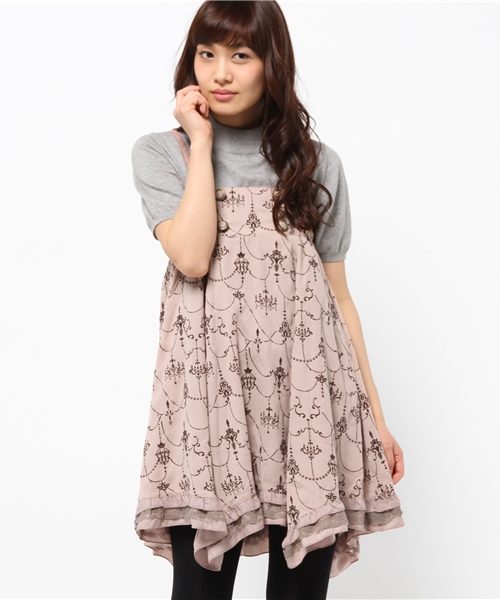 シャンデリア調の柄がフロッキープリントされたスカートです。ミディ丈で2WAYの為、様々なコーディネートを楽しめます。