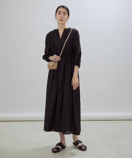 1枚で着映えする、揺れるシルエットが女性らしいギャザーワンピース■デザイン/シルエットフロント~ウエストに寄せたたっぷりのギャザーがポイントのロングワンピース。女性らしい印象のボリュームスリーブもポイントです。首元はスッキリとしたキーネック/Vネックで抜け感をプラス。ウエスト部分のギャザーは調整可能なのでギュッと絞ってウエストマークしたりあえて緩めにしてリラックス感のあるシルエットにしてもオススメです。ゆるっとしたシルエットで身体のラインを拾いすぎないのも嬉しいポイントです。合わせやすいベージュとブラックの2色展開です。*胸元のギャザー部分は調整不可です。■素材レーヨン混の滑らかで肌ざわりの良い素材を使用。サラッとしているので長い季節着やすい1枚です。■コーディネート1枚でも様になる着映えワンピースですが季節の代わり目はタートルネック等をインしてもオススメ。ジレ等のレイヤードアイテムや、アクセサリー、帽子等をプラスしても◎■モデル身長:172cm 着用サイズ:F-----------------------------裏地:なし光沢感:なし透け感:なしポケット:なし伸縮性:なし生地の厚さ:やや薄手-----------------------------