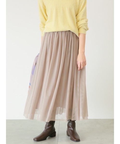 程よい透け感のあるチュール素材がやわらかい印象を与えるスカート。 ウエストにはギャザーを施し、ふんわりと立体的なシルエットを描きます。 カラーによってさまざまな雰囲気を楽しめるのも魅力◎ デイリーユースはもちろん、ドレッシーな着こなしにもぴったりなアイテムです。 ※商品画像は、撮影環境やお客様のご利用のPC・スマートフォンのモニター環境などにより実物と色味に差異がある場合がございます。 【その他採寸】 F ウエスト:[ゴム仕様]62cm