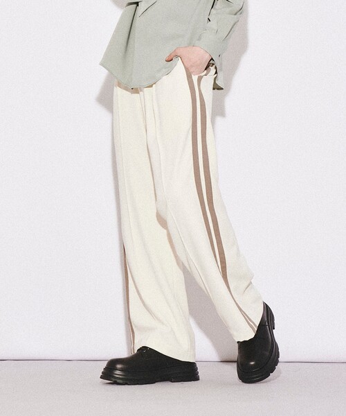 完成された美シルエットラインパンツ 【素材】 上品な光沢と滑らかな落ち感が特徴の素材。 ドライなタッチが履き心地抜群です。 【デザイン】 美しいラインを表現してくれるワイドフレアシルエットパンツ。 サイドにはラインテープを叩きつけ、遊び心をプラスしながらもこかクラシカルな雰囲気のあるディティールに。 素材感、サイドラインディティール、フレアシルエットがうまくマッチした今季オススメの一本です。 【スタイリング】 幅広いアイテムと相性が◎ ワイドフレア特有のモードな雰囲気の中にサイドラインの抜け感が今らしく 差別化の図れたスタイルがお楽しみいただけます。 また、タックインスタイルもオススメでスタイルアップにつながります。 ※ポケット数:横×2、後ろ×2 【推奨サイズ】 02サイズ(M):165~175cm 03サイズ(L):170~180cm ※標準体型を基にした目安になります。 - BRAND CONCEPT - 時代を超えて支持されるトラディショナルなアイテムをベースに、アソビ心とストリートの自由な発想を取り入れ、日本独自のミックススタイルを提案します。 【気になる商品はお気に入り登録をおススメ】 ▼商品のお気に入り登録 完売しているカラーの再入荷通知や、ラスト1点、セールの通知をお知らせいたします。 ▼ブランドのお気に入り登録 新商品や再入荷など、いち早くブランドの情報を受け取ることができます。 モデル情報:身長175cm B83 W66 H87 着用サイズ:03(L) 店舗へのお問い合わせ商品番号:170-76110 ●製品寸法: 02(M):W74cm H108cm 股下72cm 前股上29cm 渡り幅36cm 裾幅30cm 03(L):W78cm H112cm 股下74cm 前股上30cm 渡り幅37cm 裾幅30cm 備考: