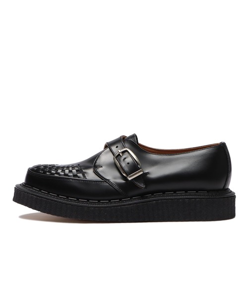 1906年にイギリスで産まれたシューズブランド。 50年代にイギリスのユースカルチャーである「テディボーイ」のアイテムとして人気を集め、その後は「セックス・ピストルズ」や「クラッシュ」といったミュージシャンに愛され、パンクやロカビリーなどのUKカルチャーには欠かせないシューズブランドとして人気となりました。 常に時代の最先端を行く個性的なデザインは、現在も目が離せないブランドです。 象徴的なインターレース(甲の部分)とモンクストラップアッパーのALASKA(アラスカ)。 オリジナルのグッドイヤーウェルテッド製法。 ソールは、伝統的なマッドガード(サイド)のIV番クレープソール。 Ⅳ番ソールの厚さは、つま先21mm/踵33mm ※天然皮革を使用しているため、多少の色ムラや生産過程で生じる傷が多少ある場合がございますので、予めご了承ください。