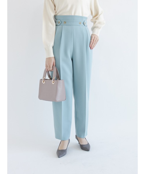 裾に向かって細くなるテーパードシルエットが美しい脚のラインを演出するパンツ。ウエストにはボタンがあしらわれ、クラシカルな印象を与えます。バックのウエストゴム仕様が、快適な穿き心地を実現◎トップスをインすればスタイルアップ効果も得られるアイテムです。※商品画像は、撮影環境やお客様のご利用のPC・スマートフォンのモニター環境などにより実物と色味に差異がある場合がございます。【その他採寸】S ウエスト:[後ゴム仕様] 62cm M ウエスト:[後ゴム仕様] 68cm