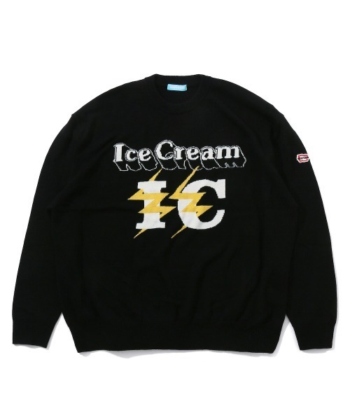 フロント部分に〈ICECREAM〉の「IC」に稲妻のグラフィックが施されたKNIT SWEATER。 左腕に施されたロゴや付属の缶バッジがアクセントに。