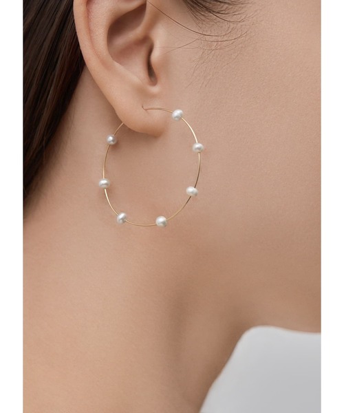 針金状の華奢な線径が可愛い、繊細な表情のフープピアス。最小限まで細くしたフープなので、まるでパールが宙に浮いているかのような、ロマンティックな表情です。 淡水パールならではの自然なパールの形も可愛く、羽のように軽い着け心地も◎ どのような方にも素敵ですが、とくにショートヘアの方には(とても映えそうなので)お薦めしたいピアスです。 【その他の特徴】 ◆スッキリとして上品。女性らしい感じのデザイン ◆線が細いため、耳たぶの小さな方や華奢な方にもお似合い ◆とても軽量な着け心地 ◆キャッチが無い一体型タイプで、どの角度から見てもオシャレな印象 ◆金属部分の色:ゴールド 【お手入れについて】 ※ピアスを外したら、毎回メガネ拭き用の布などで拭き、皮脂や指紋を落とすようにします(ウェットタイプ、研磨剤入りは不可)。 ※入浴時、スポーツ時、就寝時には外してください。質感が劣化し、破損の原因になります。 ※こちらの商品は繊細な構造なので、常に優しく扱い・不可がかからないようにしてください。力がかかるとフープが変形する原因になります。