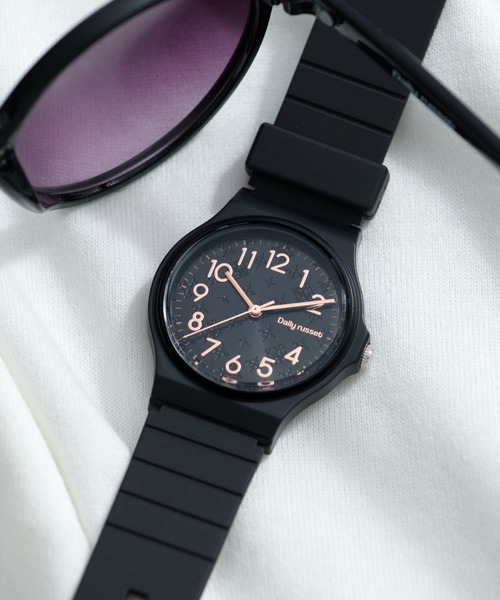 ◆カジュアルなプチプラ腕時計◆ボディがブラックで統一された飽きの来ないシンプルな腕時計です。着け心地が良く、より身軽でカジュアルに。ベルト部分は水に強く汚れにくいのでお手入れも簡単にできます。幅広いスタイルとも好相性抜群、ひとつ持っておくと大活躍間違いなし。※保証書が同封されておりますので、納品書と一緒にし無くさずに保管をお願いいたします。※生活防水は付いておりません。≪ポイント≫・ベルト部分は水に強く汚れにくい・軽い着け心地・ユニセックスなデザイン≪仕様≫・電池式・ムーブメント日本製≪着用スタッフ身長≫154cm▼商品画像について▼※撮影場所やお使いのモニター環境により実際の商品と若干お色味が異なる場合がございます。※こちらの商品はサンプルで撮影をしております。実際の商品とは若干の仕様が変更になる場合がございますので予めご了承の上ご注文くださいますようお願いいたします。《お買い物をよりお楽しみいただくために》▼商品のお気に入り登録♡をクリックして、お気に入り登録すると完売カラーの再入荷通知や、ラスト1点の通知をお知らせします。▼ブランドのお気に入り登録新商品や再入荷など、いち早くDaily russetのお得な情報を受け取ることができます。