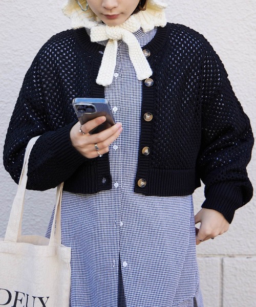 薄手のかぎ編みニットカーディガンでレトロスタイルに。ヴィンテージライクなデザインと鼈甲風のボタンでおしゃれ感をプラスしてくれる。トレンドの「ショート丈」で旬の雰囲気も醸し出す。春先の羽織としても便利なシンプルさで1着持っていると使えるアイテム。