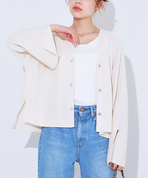 着心地の良いワッフル生地を使用したカーディガン。サイドと袖に施されたスリットデザインが抜け感を出し大人な印象に。ゆったりとしたシルエットで身体のラインを拾わず、体型カバーも◎前側の着丈がやや短めなので、ボリュームのあるボトムと合わせてもバランスよく着られてGOOD!【注意事項】※商品画像は、光の当たり具合やパソコンなどの閲覧環境により、実際の色味と異なって見える場合がございます。あらかじめご了承ください。※画像の商品はサンプルです。実際の商品と仕様、加工が若干異なる場合があります。※サイズ表記はあくまで目安となります。※その他の予約商品、通常商品との同時決済はできません。※入荷状況により、お届け予定が前後する場合があります。※お客様への発送が店頭販売より遅れる場合もあります。※追加生産商品は、一部の店舗、通販で販売中の場合がございます。予めご了承下さい。※商品の色味の目安は、商品単体の画像をご参照ください。※商品を使用前に、タグ等に記載されている「取り扱い上の注意書き」「洗濯表示」を必ずご確認ください。※商品に不良が無い場合、包装紙および箱の彼損がございましても発送いたします。あらかじめご了承ください。