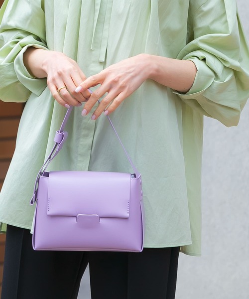 【スタイリングを引き立てる、フロントクリップハンドバッグ】 スクエア型のデザインが、幅広いスタイリングに好相性ハンドバッグ。きちんと見えるコンパクトな印象でありながら、しっかり物が収納できる容量の良さもポイントです◎ハンドバッグとしてだけでなく、ショルダーベルトで斜めがけもできる2WAYデザイン。ベーシックなOFFWHITE、気分を高める鮮やかなPURPLE・GRYGREENの3色展開でご用意しました。 ※軽い汚れは、中性洗剤をうすめた液をタオルに含ませて拭き取り、その後水を含ませたタオルで残っている洗剤を拭き取ってください。 ※特殊素材のため、着用、経過年数により、色落ちや硬化、劣化が起こることがあります。 ※その他お取り扱いに関しましては、商品に付属のアテンションタグをご覧ください。 総重量 : 約250g ※商品画像は、光の当たり具合やパソコンなどの閲覧環境により、実際の色味と異なって見える場合がございます。予めご了承ください。 ※商品の色味の目安は、商品単体の画像をご参照ください。 -