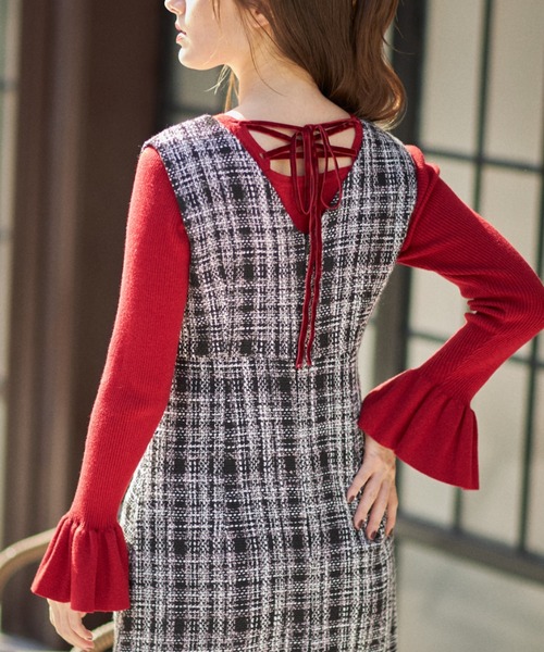 ティファニー春香さんとのコラボアイテム。 バックシャンなリブニットプルオーバーです♪ ヘルシーな肌見せができる背中のレースアップデザインで、 後ろ姿まで愛らしく魅せてくれるのがポイント! 大きなフリルの袖口で手元の仕草までエレガントに。 コンパクトに着られるリブニット生地だから ジャンスカ等とのレイヤードコーデにも重宝します◎