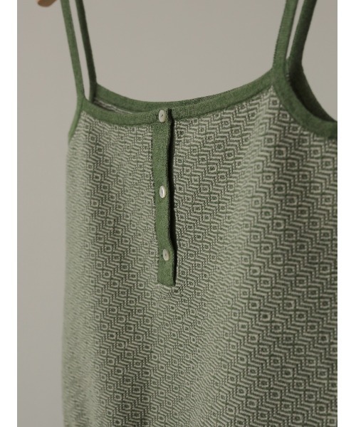 レトロなジャカード柄を使用したコンパクトなサイズ感のキャミソール。パープルは凹凸のある波のようなリップルボーダー柄。グリーンはレトロなスクエアモノトーン柄です。着心地の良いコットンで編み上げており、ストレッチ性のある1枚です。前後どちらでも着ることができる2wayデザイン。柄の雰囲気で肩紐の細さを変えています。