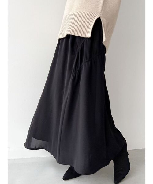シャーリング加工を施したスカート▽Point▽シャーリング加工を施し、ゆるやかなマーメイドシルエットにしたスカート。身体のラインを拾わないシルエットなので着やすさ◎裾の揺れ感にもこだわり、抜け感のあるコーデが完成します。裾に透け感を出したことでオールシーズン使える1枚。使いやすいベーシックカラーで万能に使えます♪