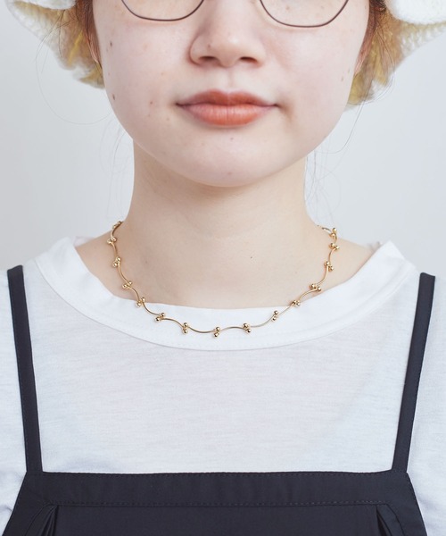 衿元にさりげなくポイントを作ってくれるアクセサリー。チョーカーに近いイメージで作りました。存在感を出し過ぎず首周りをマークすることでカジュアルなTシャツでもぐっとシックになります。首周りのよいお供になってくれるアイテムです。※光の関係で実物の商品の色味とは若干異なる場合がございます。あらかじめご了承ください。※商品はサンプルです。実際の商品と仕様、加工、サイズが若干異なる場合がございます。 ※取り扱いの注意については取り扱い表示をよくご確認の上、着用をお願いいたします。 fig London(フィグロンドン) CONCEPT English vintage & country inspired natural look joy of slow life relax & cosy playful & curious イギリスのヴィンテージやカントリーを感じさせるナチュラルルック ちょっと間の抜けたゆったりライフの楽しみ リラックスできて着心地が良い 遊びごころがあり好奇心がわく イメージ、カタチ