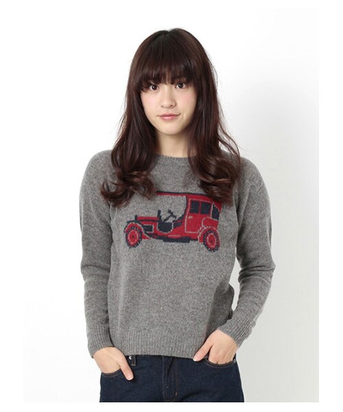スタンダードなシルエットのジャガードニットプルオーバーです。胸元にあしらったクラシックな車がひときわ目をひくアイテムです。カラフルなカラーバリエーションをそろえているので、お気に入りの1枚を選んでください。【モデル身長:約162cm/着用サイズ:Mサイズ】