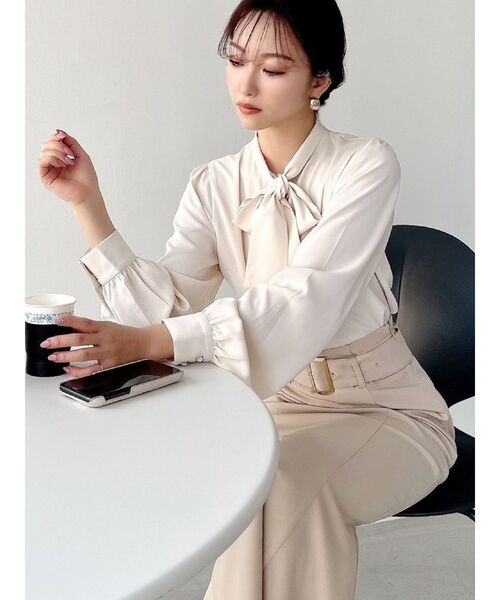 トレンドのボウタイブラウス ▽Point▽ 1枚で上品なキレイ目スタイリングになるアイテム。 シンプルなデザインのブラウスで首元のリボンが可愛いさをUP! とろみ素材でヘルシーな色気を演出し、洗練された印象に◎ 主張しすぎない包みボタンにしたのもポイント。 万能に使えるアイボリーと、線画の花柄の2色が新登場。 ▽Styling▽ パンツコーデにもスカートコーデにもマッチする万能ブラウス。 キッチリ感も出るブラウスなのでオフィスカジュアルにも使える1枚です。 今季はジャンスカとのレイヤードや、コート・ジャケットのインナーに着て 首元からリボンを出したスタイリングもオススメ♪ おしゃれなコーディネートが楽しめる一枚です。