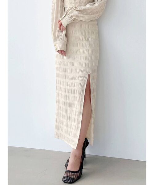 ギンガムチェックがポイントのスカート ▽Point▽ 細かいギンガムチェック柄の生地を使用、ディープスリットを入れ トレンド感溢れるスカートに仕上げました♪ 生地全体が表面変化のある生地になっておりさらにデザイン性あるスカートに。 膝下は裏地をなくし透け感のあるデザインにしました。 ハイウエストなので縦のラインを強調し足長効果抜群の1枚です。 ▽Styling▽ 同じ生地のブラウスとのセットアップ着用がオススメ◎ シンプルな形のタイトスカートなので様々なトップスと相性抜群!