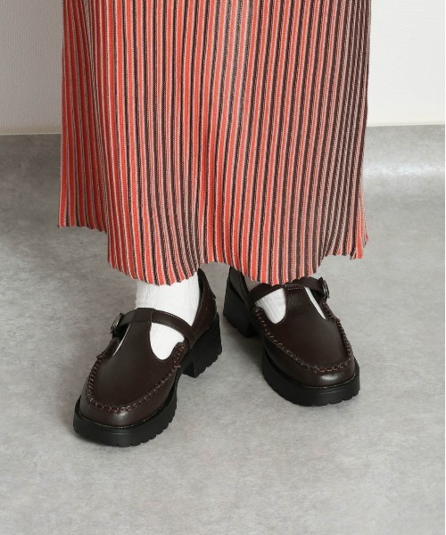 トレンド感溢れるルックスに仕上げたローファー。(CTC-0129)Tストラップローファーの追加生産分です。 ◇Point◇ スクエア型のつま先が特徴的なボリュームソールのローファー。 マニッシュなシューズをTストラップデザインで女性らしく仕上げています。 ◇Material◇ 合成皮革なので、ソフトでやわらかい履き心地です。 ストラップはバックルを引っ掛けるタイプなので着脱がスムーズにできます。 ◇Coordinate◇ カラーソックスやラインソックス合わせて、今季オススメのプレッピースタイル。 パンツはもちろんのこと、クラシカルなスカートやワンピースに合わせて存在感あるワンポイントに。