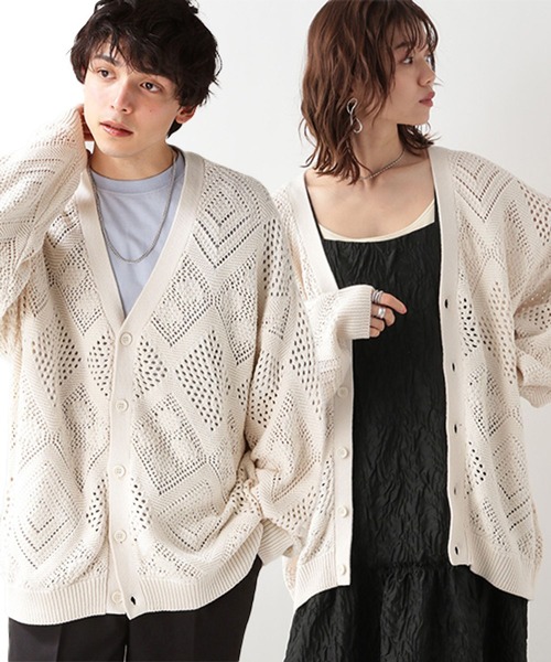 ーーー ■商品名■ スカシアミカーデ 透かし編みで構成されたデザイン性高いニットカーディガンが登場! 編み目を透かすことで季節感をより演出するニットカーディガンが登場しました! ユニセックスで女性の方にもおすすめで可愛く着れるのが嬉しいポイント〇 ■シルエット 肩幅・身幅にゆとりを持たせたトレンドのルーズシルエット/オーバーサイズに仕上げました。 肩は落ち感のあるドロップショルダー仕様になっているのでトレンド感溢れるシルエットになっています。 ゆとりのあるサイズ感なので、ユニセックスで女性の方にもおすすめです。 ■素材 肌触りが良く着心地のいいコットン100%で仕上げました。 羽織りアイテムとして取り入れやすい透かし編みのニットは様々なシーンでご利用いただけます。 ■ディテール 羽織るだけで春らしい印象を与えることができる透かし編みニットカーディガンが登場しました! 裾はリブにすることで丸みを帯びたバルーンシルエットに。 あえてインナーにカラーを取り入れ透かすことで差し色をチラ見せするのも〇 ーーー