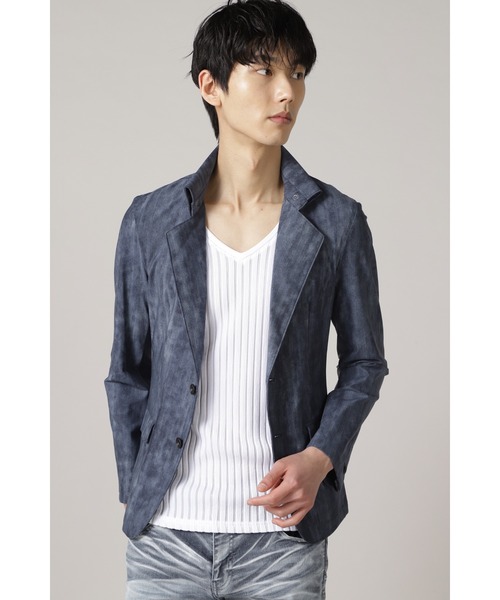 <DESIGN> デニム柄のハイテンション素材を使用したジャケット。トルネードマート定番の返し衿デザインは首回りをシャープに演出してくれます。 程よいシャープなウエストラインに、前振りの袖が綺麗なシルエットを作り出してくれます。 <TEXTILE> 滑らかなナイロンハイテンションにプリントでムラデニムを表現しています。 ハイテンションならではの高いストレッチ性と素材のハリ感による仕立てのシルエットのシャープさやキレイさが特徴です。