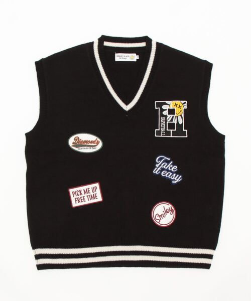 SMILEY FACEからニコちゃんマークが愛らしい、ストリート映え間違いなしのスマイルワッペンニットベストの登場です♪◇DETAIL◇SMILEY FACEらしいPOPなアートワークが目を惹くニットベストです。様々なワッペンが配された印象的なフロントデザインが魅力のアイテムです。Vネックなので、レイヤードしやすいのもうれしいポイントです。襟と裾はリブ編に切り替えられラインを入れることでカジュアルな印象に仕上げています。暖かみがあり手入れのし易さも魅力のアクリルニットを使用しています。◇コーディネート◇これからの季節はシャツや薄手のタートルニットの合わせがおススメ。春にはロンTや、もう少し暖かい季節はTシャツの上からと、オールシーズン活躍するアイテムです。カジュアルなデザインなので、普段お使いの定番アイテムとの相性抜群。これ一枚で主役になるので、ボトムスはシンプルなものを選んで。少しゆったりめのサイズ感を選んでいただくと、よりストリート感、カジュアル感が引き立ちます。キレイ目スタイルを目指すならジャストサイズを。【SMILEY FACE/スマイリーフェイス】1963年にハーベイ・ボールによってアメリカで創作されたデザイン。ニコちゃんマークが愛らしくで世界中から認知度の高いブランド。アイコニックなデザインアイテムが多く、カジュアル、ストリートシーンで人気を博しています。