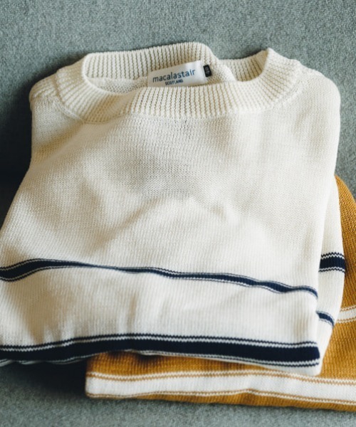 独特なボーダーデザインと風合いが魅力ガンジーニットのネックガジェットやガーター編みを入れ、ボーダーデザインはブランドアーカイブを元に組まれたクルーネックニット。特徴的なシャリ感があるコットンは擬麻加工という綿糸に環境・人体にも優しい天然素材コーティングをして麻のような風合いを出した素材です。デニムやチノパンなどカジュアルなコーディネートと好相性の1枚です。Model:H175cm Size:40※商品の色味は白背景商品単体で撮影した画像をご参照ください。※屋外撮影による光の当たり具合やパソコンなどの閲覧環境によって、実際の色味と異なって見える場合がございます。予めご了承ください。【お気に入り機能を使ってお得な情報をGET!】●商品のお気に入り登録(ハートマークをクリック) ・残り1点、再入荷、お得なセールやクーポンなどの通知を受け取れます。・お気に入りした商品は一覧で閲覧でき、あとで見返すのに便利です。●ショップ・ブランドのお気に入り登録・新商品や再入荷、クーポン配布などいち早くブランドのお得な情報を受け取ることができます。Macalastair / マカラスター1981年にスコットランドで創業したニットメーカー。スコットランドに拠点を持つマカラスターは、正真正銘の英国ブランドとして世界中の紳士・淑女に愛されています。ハンドフレーム(手横編み機)製法によるスコットランドの伝統的な柄やモチーフを活かしたジャカード・ケーブル編みで有名。また、英国内外問わずあらゆる著名ブランドやデザイナーの生産を行ってきた実績もあります。