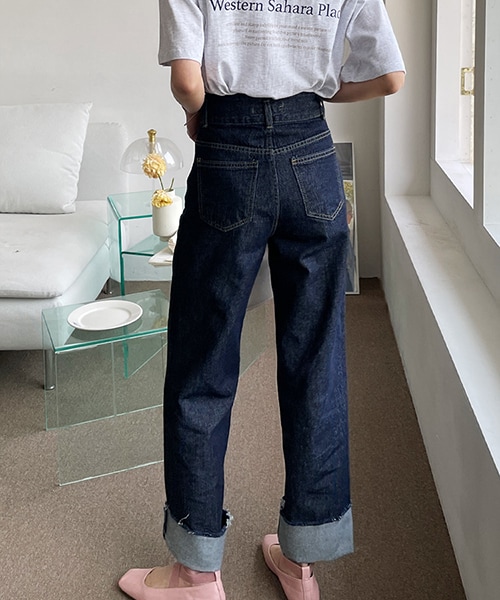 [DESIGN]ツーボタンがポイントになったお色味が自慢のインディゴデニムパンツです。カットオフで抜け感もプラスしました。ボタンとファスナーで開閉ができ、前後に便利なポケットとベルトループ付き。ゆとりがあるので動きやすく足長効果のあるハイウエストデザイン。Tシャツやシャツなど好みのトップスをインすると◎ ※ストーンウォッシュ加工のため、まれにポケットに石が入っている場合がございますが不備ではありません。