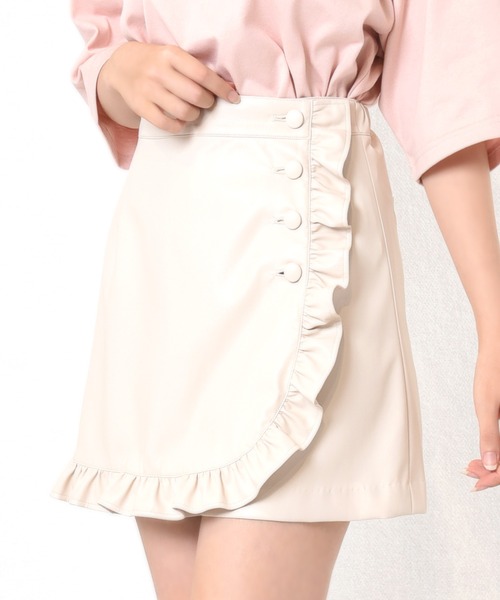 前からはミニスカートに見えるキュロット。 エプロン風のフリルの切り替えがキュート♪ 柔らかなフェイクレザーを使用しています。 A,クリーム B,ブラック