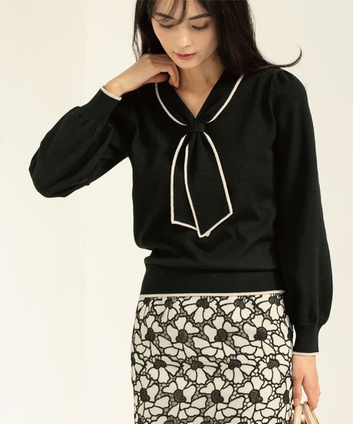 大人気のボウタイニットが配色デザインで再登場。立体的なボウタイが華やかなラメアソートニット。【素材】・ふんわりと暖かな四者混の素材を使用。・ファインゲージで編立、程よい厚みがありながらもたつかずアウターインでもOKな程よい肉感。・上品な見えが叶う柔らかな光沢感があります。・マシンウォッシャブルなのでご自宅でお洗濯可能です。※こちらの商品はやや透け感があるため、インナーの着用をおすすめします。【デザイン】・リング状のパーツに棒を差し込むデザインで、簡単にきれいなボウタイの形が仕上がります。・ネック開きを控えめにし、上品にすっきり見え。・さりげないパフスリーブが柔らかな印象をプラス。・シルエットはコンパクトに仕上げているので、タックインスタイルもすっきり決まります。【カラー】・オフベースにブラックの配色(503)、ブラックベースにグレージュの配色(519)、ブルーベースにグレージュの配色(591)、アイボリー・ゴールドラメベースにホワイトの配色(602)、この時期にぴったりな柔らかなカラー展開です。こちらの商品は主に冬に着用いただける商品です。モデル情報:身長166cm B80 W58 H83 着用サイズ:38(M)店舗へのお問い合わせ商品番号:C58-15060●製品寸法:36(S):着丈51cm B80cm 袖丈57cm 肩幅30cm38(M):着丈52cm B83cm 袖丈58cm 肩幅31cm40(L):着丈53cm B86cm 袖丈59cm 肩幅33cm42(LL):着丈55cm B90cm 袖丈60cm 肩幅35cm備考:
