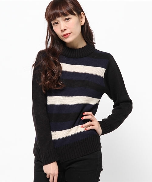 mystic(ミスティック) 配色使いが可愛いボーダーニットプルオーバー。 カラフルで冬のコーディネイトのポイントになります◎ トレンドのハイネックデザインでと程よくフィットしたシルエットでスタイリッシュに着て頂けます。