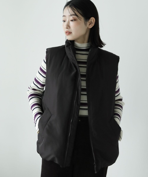 今季トレンドの中綿ベスト。ゆったりと、ラクに着用できるオーバーサイズに仕上げています。アームホールはやや大きめにすることで、合わせるトップスを選びません。裾にギャザーを入れることで、女性らしい丸みのあるシルエットに。【素材】ふわっとボリューム感のある中綿入り。表面には、セミマットなポリエステル素材を使用しています。【スタイリング】ニットやスウェットはもちろん、コートやジャケットなどのアウターとのレイヤードもおすすめです。オーバーサイズなので、ユニセックスでもお使いいただける1枚。