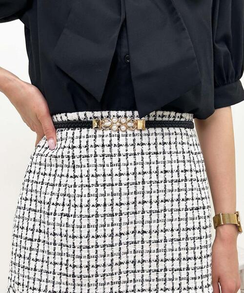 2023 SS 春夏アイテム リュクスなゴールドパーツにパールビジューをあしらった華やかバックルのベルト。 細めの帯はゴムになっているのでフィット感良く付けられます。 引っかけるだけの簡単着脱で使いやすいのもポイント。 上品な印象のアイテムなので普段使いはもちろん、お出かけシーンにもおすすめです。 シャツやワンピースに合わせてウエストマークしても◎。 ・合成皮革