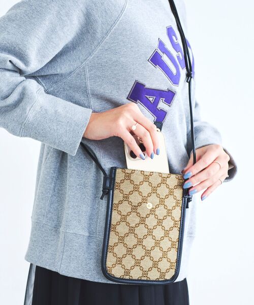 【バッグで人気のジャガード柄がスマホショルダーに!】 キャッシュレス化が進み手元にある機会がもっと増えたスマートフォンもすぐに取り出し可能。 スマホの他にリップなどの小物やそのままお金も入れられる便利なアイテムです。 構造がシンプルなので軽く、ポケットのように気軽に身につけられるのが魅力のひとつ。 上品なジャガードはいつだって大人の魅力を引き出してくれます。 スマホケースの種類にも対応できるよう、厚みや幅のでる手帳タイプのスマホケースもそのまますっぽり収納◎ ショルダー部分はスライド式で長さが調節できるのでネックレスのように首に掛けても、 長くしてななめに掛けてもおしゃれにお持ちいただけます。 バッグ内にもすっぽり入るので、ジャガードバッグシリーズとお揃いで持つのもオススメです。 旅先ではすぐに取り出したいときに、大きなトラベルバッグと分けて持ち歩きにも便利。 両手が空くので様々なシーンに活躍してくれます。