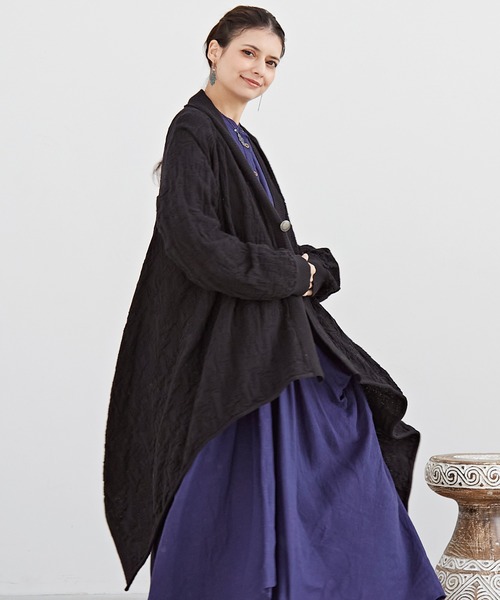 ペイズリー柄を凹凸感のあるジャカード織りで表現したコットン二ットの変形カーディガン。両サイドが長めのイレギュラーヘムで個性的なスタイルに。コンチョボタンもデザインポイント。ニット素材の落ち感がラフさを演出し、カジュアルに着られます。ゆったりとしたオーバーサイズで、メンズはもちろんユニセックスで着用可能です。※こちらの商品は1点1点職人による手作りとなります。その為、形や色合いなど若干異なる場合がございます。あらかじめご了承ください。※屋外での撮影画像は、光の当たり具合で色味・カラーが違って見える場合がございます。商品のカラーは、スタジオ撮影の画像をご参照ください。Amina Collection Co.,LTD.