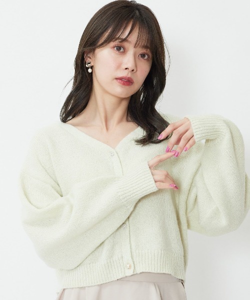 コーディネイトのポイントに活躍するフラワービジュ釦カーディガン【Design】・デコルテの開き具合がヘルシーな印象をもたらすカーディガン。・フラワービジュ釦がシンプルなデザインの中でも華やかなポイントに。・コンパクトな丈感がウエスト位置を高く見せ、スタイルアップ効果も抜群♪・程よいボリューム感のスリーブが柔らかな印象を引き立てます。・カーディガンとしてはもちろん、フロントボタンを閉めてトップスとして着用するのもオススメです。【Fabric】・ややふわっとした表面感の柔らかなニット生地を使用。・ご自宅でお手入れが出来るのも嬉しいポイント♪・春の華やぎ感を演出する、オフホワイト、イエロー、ピンクの3色展開となります。【Care】手洗い可能M:(02):着丈44.5㎝/身幅53㎝/天巾22㎝/裄丈49.5㎝/袖巾25.5㎝/袖口丈8.5㎝/裾巾45㎝
