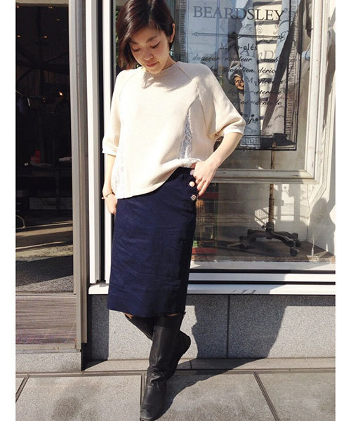 前回ご好評をいただいたBEARDSLEYのデニムスカート。新作のデニムスカートは、シンプルなシルエット。ポイントはビジューボタン。ひとつひとつ表情の違うボタン。おしゃれ心を擽られてしまいます。素材はストレッチデニムですので穿きやすく動きやすいです。