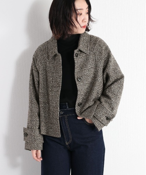 一着ほしい、新鮮な丈感のショートコート CCE-0815:カットメルトンショートジャケットの追加生産分です。 ◇Point◇ アウターの定番生地、カットメルトンを、トレンドのショート丈デザインに仕上げました。 飽きが来ず長く愛用いただけるような、ナチュラルでやさしい色合いの無地2色と、今季らしいツイードの3色でご用意〇 ◇Material◇ メルトン生地は、厚地で滑らかな手触りの、冬の代表的なアウターであるダッフルコートやピーコートなどによく用いられる生地です。 フェルトのような感触があり、保温性が高く暖かいのが特徴。裏地付きです。 ◇Coordinate◇ どんなコーデともバランスをとりやすい着丈です。 デニムやチノパン、カーゴパンツなど定番やミリタリーテイストのコーデや、ロングスカートやワンピースなどレディな雰囲気のコーデで合わせるのがおすすめ! ※照明や天候により実際の色味と異なって見える場合がございます。ご了承くださいませ。
