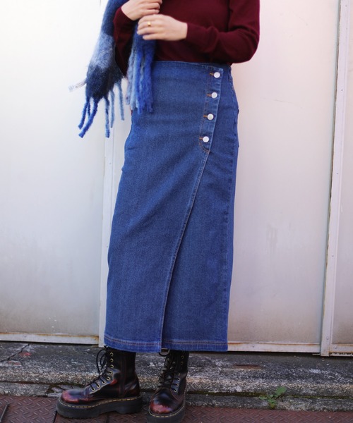 ウエストサイドから斜めボタン止めったスリットスカートです。 フロントにこだわりの曲線スリットラインが、下半身を綺麗に見える+ハイウエストのデザインが脚長効果もあります。 大人っぽいカジュアルスタイルを演出してくれる1枚です。 着痩せ見えするIラインシルエットが可愛い、どんなアイテムでも合わせます。 12オンス肉厚のストレッチデニム生地使用し、ムラ感保つながら履きやすいです。 クロップド丈で様々なシューズに合わせやすいです 前スリット入りで歩きやす、こ毎日履きたくなリます。 定番のインディゴブルー+ケミカルブラックの3色が合わせやすさ抜群 コーディネート オールシーズン使える、定番のデニムスカート。 秋冬にはサイドゴアブーツやハイカットスニーカーを合わせて、春夏にはビーチサンダルやトングサンダルでサラっと履きたいアイテム。 ビッグシルエットニットはもちろん、タイトなタートルニットとも相性抜群。