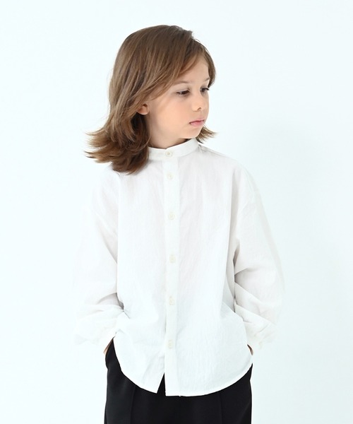 フォーマル時に使いやすいバンドカラーシャツ。ルーズフィットです。ニュアンス感を出すために元々しわっぽい生地を使用。洗濯もしやすい扱いやすい生地です。袖口はリブ付きで着脱しやすい。サイズ・120cm 130cm 140cm 150cm 160cmMODEL 01 / 120cm / 20kg / 110サイズ着用MODEL 02 / 145cm / 36kg / 150サイズ着用