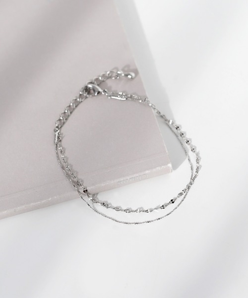 エクレアチェーンが繊細な煌めきを放ち、華やかな雰囲気をプラスするブレスレット。 2連になっているので、これ一つで重ね付けしたようなこなれた手元が完成します。 シンプルなデザインがどんなコーデにも馴染み、デイリー使いに重宝しそう♪ ※ATTENTION※ ■製造・輸送時についた微細なキズが見られる場合がございます。 上記は不良の対象外となりますので、予めご了承くださいませ。 ■引っかかりなどによる破損にご注意ください。