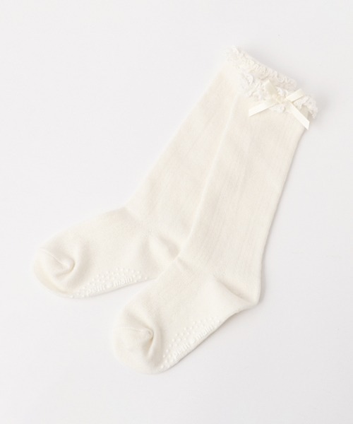 入卒式などのセレモニーシーンにぴったりなハイソックスです。シンプルデザインにエレガントなリボンを添えた華やかさが魅力。ワンピースやスカートと相性が良く、足元がすっきりと見えるのも特徴です。足裏にすべり止めプリントがついています。