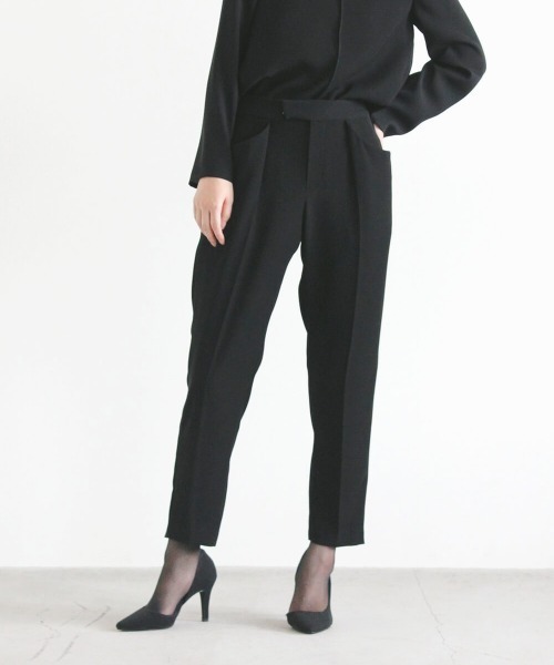 kaene定番のタックテーパードパンツ。立体的なポケットに細見え効果があり、気になる太もも部分をカバーしてくれます。足首にかけて細くなるテーパードシルエットは、足長効果も抜群のアイテムです。フォーマルシーンに対応できるフォーマルブラックカラーの生地を使用。同素材のブラウスとセットアップでご着用いただけます。また、トップス次第で普段使いやビジネスシーンでも着用していただけます。◇コーディネートアイテム シフォンドッキングブラウス / 010467 (同素材) フリルカラーブラウス / 010466 バックペプラムジャケット / 005331 リングハンドルバッグ / 040080 バイカラーパンプス / 050014◇詳細 生地の厚み:普通 伸縮性:なし 透け感:なし 光沢感:なし 裏地:なし ポケット:あり ファスナー:前開きあり その他:後ろゴム 洗濯取扱い:洗濯機洗い可※ネットを必ず使用してください・・・◆kaene Black Formal◆・・・黒の発色の濃い生地を使用してます。礼服として、結婚式や卒業式などお祝いの席から、お葬式などお悔やみの席まで、冠婚葬祭全般で着用することができるフォーマルウェアです。普段使いやビジネスシーンでも着用できるよう、シンプルなデザインにこだわりました。【着用シーン例:結婚式・入学式・卒業式 ・入園式・卒園式・七五三・お宮参り・オフィス・弔事(喪服)】・・・・・・・・・・・・・・・・・・