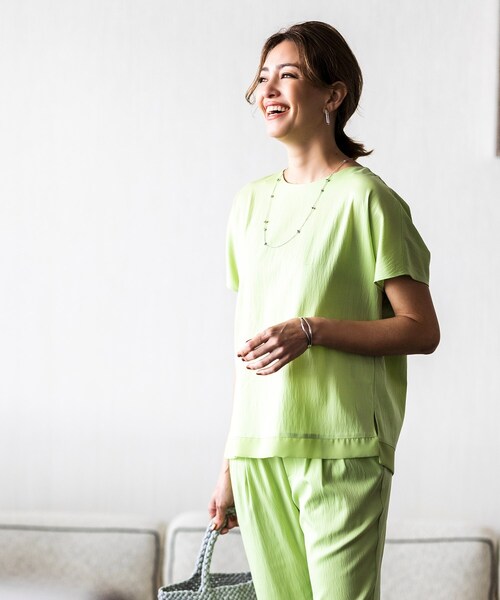 ■昨年、大好評「褒められパンツ」とベストなセットアップブラウス 【デザインポイント】 INDIVIで一番人気のタックテーパードパンツと同素材でお作りしたブラウスです。 ゆとりのあるサイジングですが、素材に落ち感があるのですっきりとシャープに見えます。 裾を同色のシフォンで切り替えているのでデザインアクセントになり着映えするTシャツ型ブラウスとしてヘビロテして頂けます。 素材は上品さのある光沢感と今っぽい表情の表面感がポイントです。 【スタイリングポイント】 同素材のパンツ(127-61013)とセットアップで合わせる事で、簡単にこなれ感のあるお洒落なスタイルが完成します。 仕事着のカジュアル化に合わせたキレイめスタイルとして気負わないリラクシー感のあるブラウスセットアップがおすすめです。 アクセを足して頂けるとセレモニー用としても活躍します。 【素材ポイント】 強く撚られたのキュプラを使用し、本来の光沢感をおさえ、深みのある発色と微光沢性を持たせた良質素材です。 シボ感とさらりとした素材由来の風合、着心地に拘ったキックバックの良いストレッチ性が特徴です。 ※こちらの商品はやや透け感があるため、インナーの着用をおすすめします。 【生地詳細】 透け感:ややあり 伸縮性:ややあり 生地の厚み:普通 裏地:なし 洗濯方法:洗濯機洗い可 こちらの商品は主に春夏に着用いただける商品です。 モデル情報:身長167cm B78 W61 H87 着用サイズ:38(M) 店舗へのお問い合わせ商品番号:127-86006 ●製品寸法: 05(XXS):着丈56cm B95cm 裄丈36cm 12(LL):着丈63cm B117cm 裄丈43cm 13(LL):着丈63cm B121cm 裄丈44cm 15(3L):着丈63cm B125cm 裄丈44cm 34(S):着丈60cm B103cm 裄丈38cm 38(M):着丈61cm B109cm 裄丈39cm 備考: