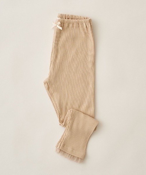 レイヤードスタイルに欠かせないレギンスは、裾にチュールフリルがついたさりげなくガーリーなデザイン。 9分丈なのでワンサイズ大きくてももたつきを感じず、裾のチュールフリルで可愛く見せてくれます。 ワンピースやチュニックなどのトップスと相性抜群アイテムです。 やわらかいテレコ素材を使用しているので動きやすく、長時間履いていてもストレスフリーで過ごせます。 ※掲載画像の商品の色味は、光の照射や角度により実物と色味が異なる場合がございます。また表示のサイズ感と実物は若干異なる場合もございますので、予めご了承ください。 【透け感】やや透ける 【生地の厚さ】普通 【伸縮性】あり 【裏地】なし 【ポケット】なし 【アジャスター】なし 【素材】本体:綿95% ポリウレタン5% チュール部分:ポリエステル100% 【原産国】中国 サイズ表記100cm【ウエスト】44【股上】20【股下】30【裾巾】7.5 サイズ表記110cm【ウエスト】46【股上】21【股下】36【裾巾】8 サイズ表記120cm【ウエスト】48【股上】22【股下】42【裾巾】8.5 サイズ表記130cm【ウエスト】50【股上】23【股下】48【裾巾】9 サイズ表記140cm【ウエスト】52【股上】24.5【股下】55【裾巾】9.5 サイズ表記150cm【ウエスト】54【股上】26【股下】62【裾巾】10