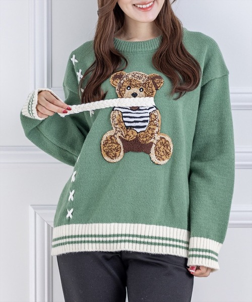 レトロちっくで愛らしいくまモチーフオーバーサイズニットトップス 【デザイン】 キュートなクマちゃんが愛らしさを高めてくれるオーバーサイズのニットトップス。 一着だけでもインパクトのあるデザインなので、単体使いはもちろんカーディガンなど 重ねても映える魅力的なアイテムです♪ 【素材感】 着心地の軽いポリエステル素材 伸縮性:あり / 透け感:なし / 裏地:なし 手洗いによる洗濯可 / ドライ・ウェットクリーニング可 【コーディネート】 カジュアルテイストだけでなく甘いテイストのコーデにもオススメなアイテムなので、 その日の気分次第で自由自在に着回しいただけます。 また、冬のルームウェアとして、ご活用いただくのもオススメです◎ 【※お取り扱い上のご注意】 1:モニター環境等により実際の商品と多少色味が異なって表示される場合がございます。予めご了承下さい。 2:屋外で撮影された商品は、天候により多少実際のカラーと異なる場合があります。商品のカラーはトルソー(マネキン)の商品画像をご参照ください。 3:濃い色の商品は、お洗濯や摩擦等による移染にご注意ください。 4:末永くご愛用頂く為に、アテンションタグ・洗濯ネームを必ずご確認の上、着用又はお取り扱い下さい。 5:生産時期により、色、サイズ、デザイン、素材の質感が多少が異なる場合がございます。あらかじめ御了承下さいませ。