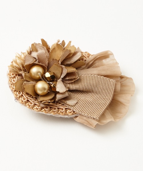 ブレードテープとフラワーモチーフを組み合わせたブローチ。厚みを抑えたすっきりとしたサイズ感でコーディネートをさりげなく華やかに格上げします。 安全ピンとクリップの両方が付いているので胸元以外にも髪飾りとしてなど幅広くお楽しみいただけます。 結婚式や二次会などのパーティーシーンや七五三や入卒などのセレモニーシーンなどにおすすめです。 ※照明の関係により、実際よりも色味が違って見える場合があります。 またパソコン・スマートフォンなどの環境により、若干製品と画像のカラーが異なる場合もございます。 予めご了承ください。
