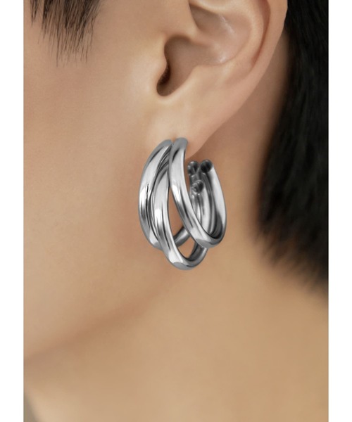 3つのフープに高低差と角度を付けて配置した、立体感のあるフープピアス。存在感とシンプルさ、華やかさとクールさなどの複数の要素がバランス良く共存した、結果としてとても使いやすいピアスです。 派手ではないのに確実に顔周りを明るくする力があり、甘さや辛口さなどのヘンなクセが無いところも大人に◎ プロデューサーの齊藤も長く愛用している、合わせやすくて飽きのこないデザインです。 ※同じデザインでイヤリングタイプもご用意しています(品番/販売ページは異なります)。 こちらのピアスは かぶれにくいステンレスポストを使用しています。キャッチ(針受け)は真鍮です。 【仕様について】 ◆3つのフープを重ねた、少しボリューム感の出るフープピアス。 ◆立体感のある構造なので、硬めの鉄をベース素材に採用(強度に優れています)。 ◆太めのパイプ状フープながらも、中空構造(中が空洞)で軽量な着け心地。 【お手入れについて】 ※ピアスは帰宅したら外し、ハンドソープで手を洗うついでに一緒に軽く洗ってしまうのが◎ 付着した皮脂や汗が落ちて酸化を遅らせ、色味やカラーがキレイに保てます。 ※洗ったあとはティッシュで軽く水気を吸い取り、タオル等の上に置いて自然乾燥させて、乾いたらしまいます。 ※着用しないときはチャック付きポリ袋などに入れて、なるべく空気に触れさせないことで質感の良さが長持ちします。 ※入浴時、スポーツ時、就寝時には外してください。質感が劣化し、破損の原因になります。