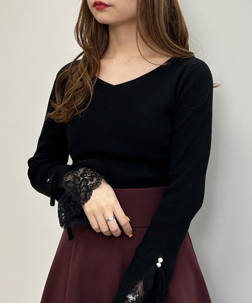 2023 SS 春夏アイテム 袖口にあしらったフリル&レースが大人フェミニンな雰囲気なニットトップス。 ボディラインに程よく沿うリブニットのシルエットと袖口のリボンとパールビジューも、レディな印象をプラスします。 デコルテがきれいに見えるVネック。 程よい裾丈でボトムスインのスタイルもすっきりキマります。 上品なアイテムなのでオンオフ問わずに大活躍。 ・ニット製品で生地が伸びやすいため、サイズに若干の誤差が生じる場合がございます。予めご了承くださいませ。 【以下クロ参考。カラーにより多少の誤差あり】 ・透け感:透けない ・伸縮性:あり ・生地の厚さ:薄い ・裏地:なし