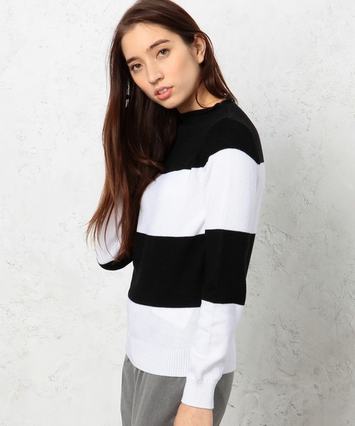 ワイドピッチのボーダー柄が個性的なプルオーバーが入荷いたしました!コットン100%のハイゲージニットは柔らかな着心地が魅力。身頃との切り替えがないボトルネックはニットならではのデザインです。シンプルなパンツとスニーカー合わせで大人なカジュアルスタイルが完成します。※同素材でワンピースもございます。店舗にお問い合わせの際は、全国のグリーンレーベル リラクシング各店まで下記の品番をお申し付け下さい。品番:3613-181-7197