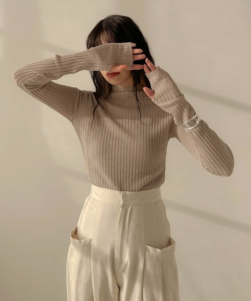 指穴あきディテールが今年らしいラメニットTOPS 【デザイン】 袖の指穴あきデザインが施されたニットプルオーバー 主張しすぎないラメが程よく入っていて光にあたるときらっと光って上品な印象に シアー素材で春におすすめの1着 太めのリブ編みで縦ラインが協調されることで細見え効果も◎ 【素材】 ほどよいラメが入った糸を使用 甘く編まれた透け感のあるリブニット ------------ 裏地 なし 透け感 あり 伸縮性 あり 光沢 ラメ部分のみあり ポケット なし 洗濯方法 手洗い可 ------------ 【スタイリング】 キャミとあわせて1枚できるのはもちろん、 シャツや裏毛プルオーバーの中にレイヤードすることでロングシーズン着用することが可能 袖口から指穴あきのディテールをのぞかせることでアームウォーマー風にも変身するトレンドニット シンプルなアイテムなので、どんなボトムとも合わせやすい着回し抜群のニットトップス ※お使いのモニター設定、お部屋の照明等により 実際の商品と色味が異なる場合がございます。 物撮り写真はできる限り実物の色に近づけるようにしておりますので、 色に関しては商品の物撮り写真をご参考ください。 ▼もっとお買い物を楽しんで頂く為に▼ 〈商品のお気に入り登録〉 お気に入りの登録をして頂きますと セールの通知・ラスト1点になった時の通知や、再入荷通知を受けることができます。 〈ブランドのお気に入り登録〉 新商品の発売や再入荷、タイムセールやクーポン発行のお知らせなど hellamがお届けするお得な情報を受け取ることができます。