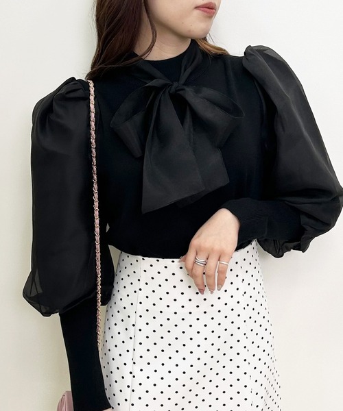 2023 SS 春夏アイテム ふんわりとしたボリューム袖を透け感のあるシアー素材で切り替えたレディライクなニット。 コンパクトなシルエットとふんわりスリーブのメリハリが、大人っぽい雰囲気を演出してくれます。 二の腕をカムフラージュしたシアー部分とすっきりとした袖口で華奢さもプラス。 前リボン後リボンの2WAYでの着こなしが可能◎ボウタイを取り外してのすっきりとしたスタイリングもでき、1着で色んな着こなしを楽しんでいただけます。 ・ニット製品で生地が伸びやすいため、サイズに若干の誤差が生じる場合がございます。予めご了承くださいませ。 【以下クロ参考。カラーにより多少の誤差あり】 ・透け感:透けない ・伸縮性:あり ・生地の厚さ:薄い ・裏地:なし ・前リボン後リボンの2WAYでの着こなしが可能 ・ボウタイを取り外しての着用可能